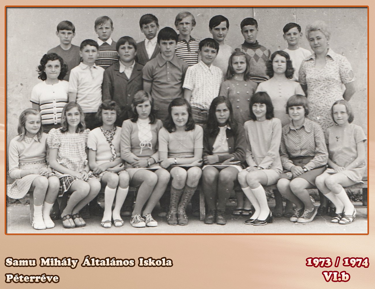 Felső sor: Bartusz Béla, Kiss János,Öreg Zoltán, Faragó Csaba, Horti Ferenc, Bovánovics Ágoston, Gallusz Dezső Középső sor: Domonkos Erzsébet, Seres Dezső, Lévai Ferenc, Tóth Ferenc, Balázs Sándor, Kiss Magdolna, Galacz Gizella, Osztályfőnök: Huszágh Zsuzsanna Ülnek: Kiss Cecília, Kiss Ildikó, Pecze Éva, Toth Magdolna, Kiss Erzsébet (Erzsébet Pál), Palatinus(?) Ibolya,Sütő Erzsébet, Doszkocs Verona, Samu Kornélia |