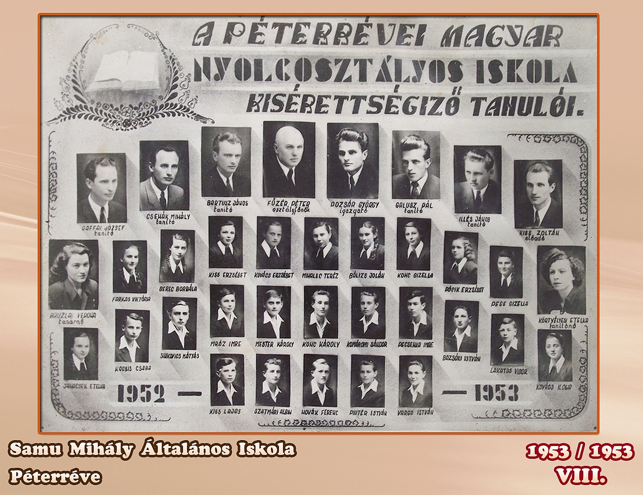 ŠKOLSKA GODINA: 1952/1953ODELJENJE: 8.-RAZREDNI STAREŠINA: Fűzér Péter