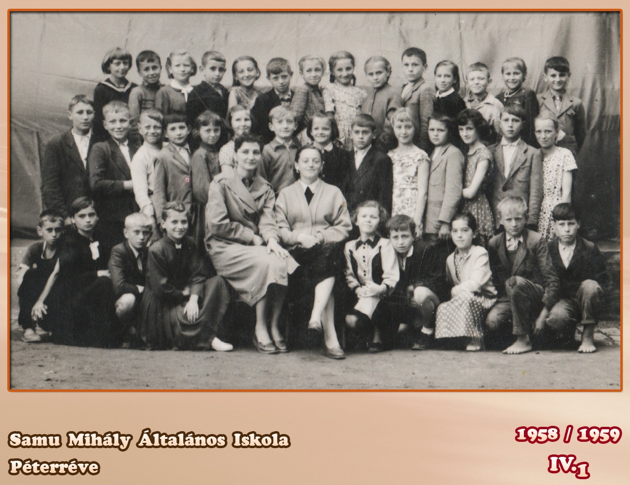 Osztálytársaim, első sor:Fercsik, Erzsébet, Bovánovics Géza, Boldizsár Piroska, Körösi Nándor, Horvát Anna, Ágoston Imre, Barna Verona, Nagy Erzsébet, Seres Ágota, Horvath Imre, Krizsák Magdolna, Goór Gábor (meghalt), Tóth Gizella, Szabó István, második sor: Erdélyi György, (?), Magó György (meghalt), Szabó László (meghalt), Horváth Tibor (meghalt), Tóth Éva, Varga Gizella, Urbán László (?), Moholi Mária, Bozsóki Ferenc, Csasznyi Franciska, Nagy Lajos, Nagy Valéria, Kovács István, Rigó Erzsébet (?), harmadik sor:Rácz József (meghalt), Urbán Anna (meghalt), Sánta János-József (meghalt), Andrusko Anna, a szerb nyelvet előadó tanítónéni (a nevét már nem tudom) Csabai Borbála (később Samu), Száraz Borbála (meghalt), Buzogány Tibor, Kasza Magdolna (meghalt), Baksa Ágoston, Hajdú István. Ez az osztály Borbálának első generációja. Ha találkoztunk, szinte minden diákjáról tudott valami régen történt esetet mesélni.Minket csak egy évig tanított, de szivünkhöz nőtt. |