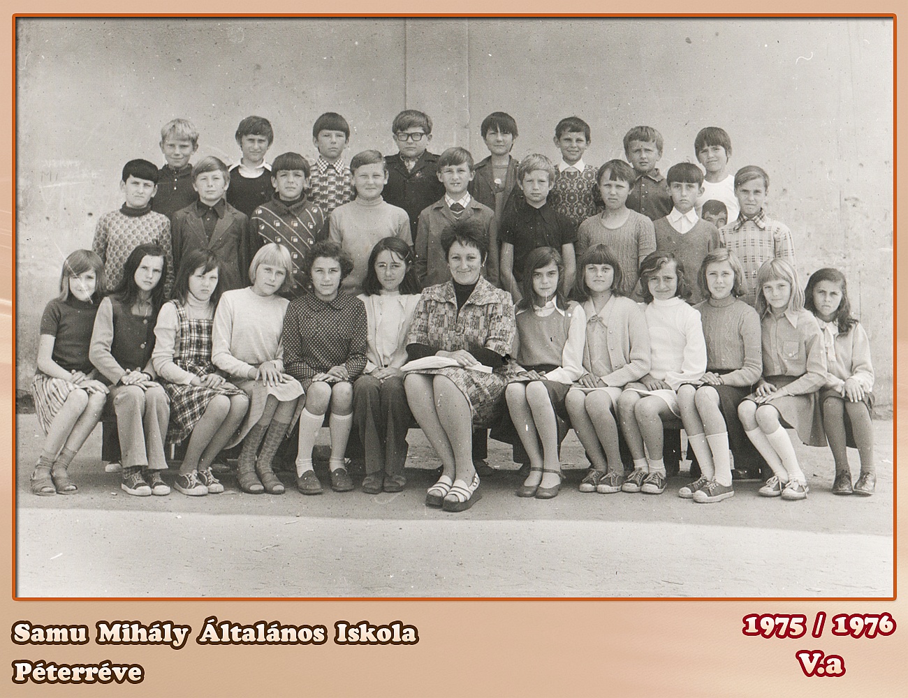 Felsö sor jobbrol balra;Konz Laszlo,Toth Ferenz,Körtvélyesi (Jozsef??),Pecsenka Robert,Zoràd Làszlo,Tapolcsànyi Sàndor,Toth Làszlo,Zita Vendel Középsö sor ugyanugy;Balassa Laszlo,Szenzi Gergely,Molnar Albert,Horvath G.Ferenz,Lejkauf Istvan,Pintér Karoly,Petze Nàndor,Raffai Imre,Hamar Jànos, Also Sor;Zita Valéria,Farago Berta,Kovàcs Eszter,Szilàgyi Ilona,Deàk Gabriella,Horvàth Erika,Szabo Eva(osztàljfönök),Horvàth Zsuzsanna,Balassa Mària,Kalmàr Mària,Csanyega Valéria,Hegedüs Mària,Goor Berta (Remélem mindnyàjatokra jol emlékezem??? korigàljatok! addig is mindannyiatokat üdvözlöm) |